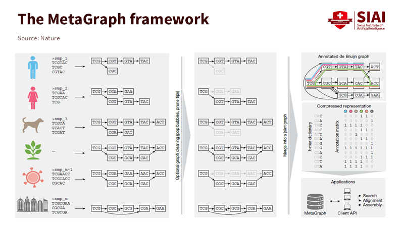 The advantages of this architecture become increasingly pronounced as data volumes grow. As the biological database GenBank expands rapidly year after year, MetaGraph enables comprehensive analysis of vast sequences ranging from viruses to humans in a single search. Instead of loading individual data files, the system simultaneously retrieves related information through connected paths. At the core of MetaGraph lies the de Bruijn graph. Sequences are divided into fixed-length fragments and connected through overlapping regions to form paths. Identical fragments appearing across multiple datasets are stored once and annotated by color to indicate provenance, thereby minimizing redundancy. This compressed structure allows fast and accurate searches even across petabase-scale sequence data.